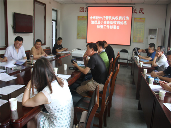 首先市价检局梁卫东书记宣读了焦作市人民政府办公室《关于建立校外托管机构管理联席会议制度的通知》(焦政办〔2017〕76号)、河南省发改委《关于开展小麦最低收购价格检查的通知》(豫发改价检〔2017〕620号)及《2017年焦作市开展校外托管机构收费行为治理工作方案》,并对上述两项工作进行动员部署:一是要深刻领会文件精神,充分认识到当前开展校外托管机构收费行为治理工作的形势,增强责任感和使命感;二是对2017年治理校外托管机构收费行为工作进行安排。治理时间:2017年7月15日前为摸底排查阶段;2017年8月底前为登记存档,实施收费公示阶段;2017年9月为集中检查阶段;三是对开展小麦最低收购价格检查工作进行安排布置。